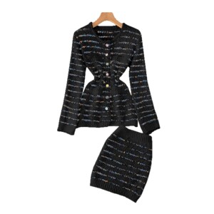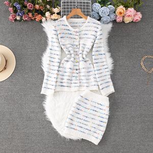 气质法式小香风套装五彩扣喇叭袖开衫毛衣包臀短款针织裙两件套冬