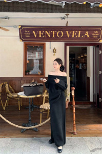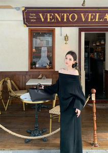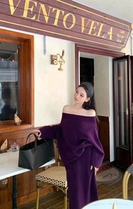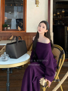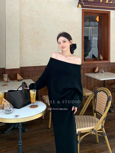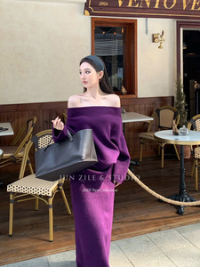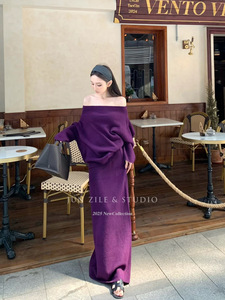 针织套装女秋季新款长袖两件套气质高级感一字肩毛衣半身裙长裙