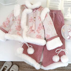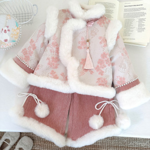 冬季女童套装新款2025加绒刺绣国风外套花边阔腿裤保暖两件套跨境
