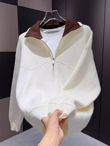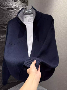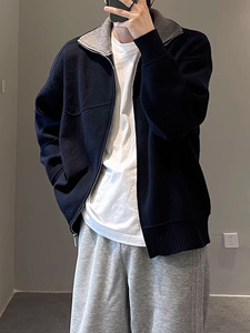 纯色冬季时尚通勤毛衣设计感翻领开衫拉链休闲男士长袖针织衫外套