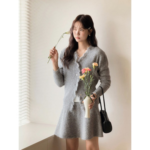 【重瓣初樱 套装】歌铭木耳花边V领针织衫+半身短裙两件套装W547C