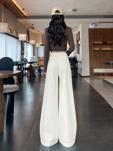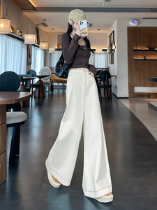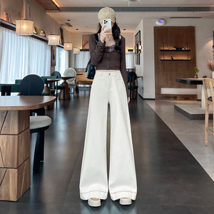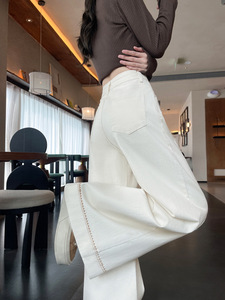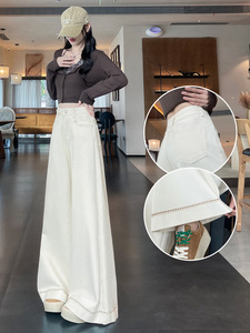 米白色牛仔裤女胖梨型身材裤子巨显瘦新款宽松慵懒风阔腿裤子刺绣