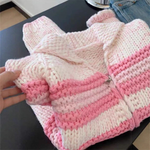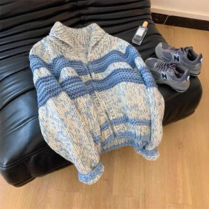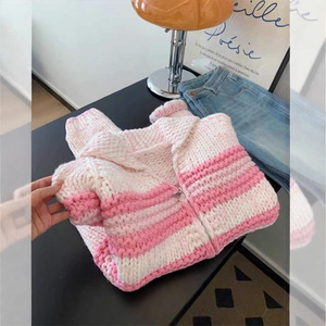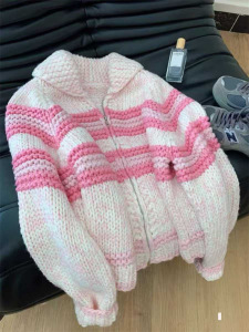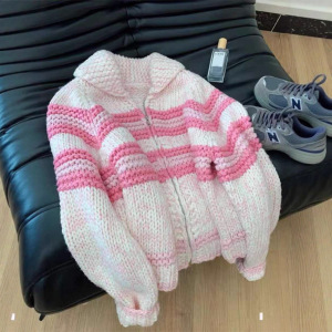 韩系复古撞色条纹翻领毛衣开衫外套女秋冬宽松慵懒风小个子针织衫