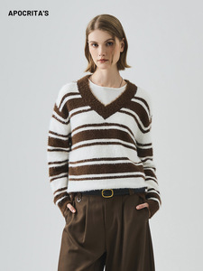 APO女装 |跨境V领毛衣女秋冬季韩系宽松慵懒风条纹长袖针织衫上衣