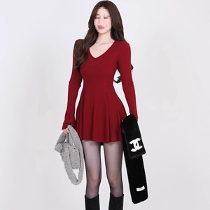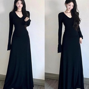黑色赫本风小黑裙春秋连衣裙女针织气质修身内搭长裙子v领连身裙