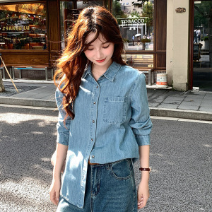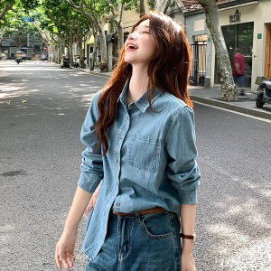 靓依轩正肩牛仔衣衬衫女2025春秋新款时尚宽松复古衬衣上衣设计感