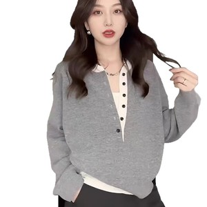 灰色拼接圆领长袖针织衫女2025新款早秋宽松设计感洋气内搭上衣女