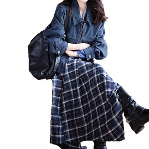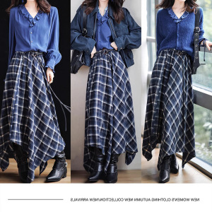 《蓝调时刻半裙》舒适人棉/撞色格纹 全松紧腰2025秋季新款时尚半