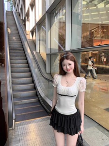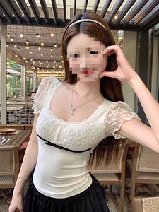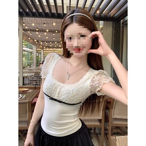 原版面料 法式复古泡泡袖蕾丝拼接蝴蝶结短袖t恤夏季修身显瘦上衣