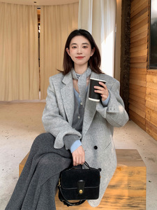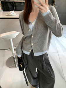 LEETWINS 假两件v领灰色针织开衫外套秋季新款设计感撞色羊毛上衣