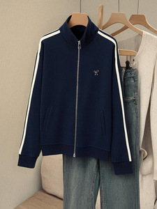藏蓝色条纹拉链卫衣外套女春秋款2025秋冬外搭运动夹克开衫上衣