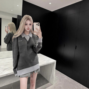 mm25秋冬新款韩版学院风时髦翻领假两件拼接针织长袖