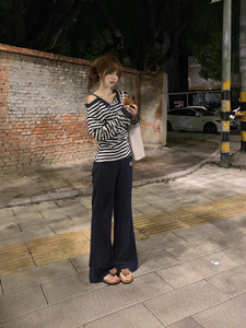 甜辣妹条纹长袖T恤女2025早秋新款慵懒宽松一字肩内搭打底衫上衣