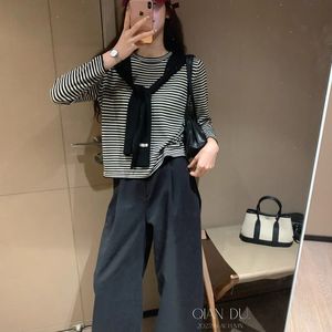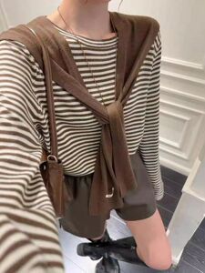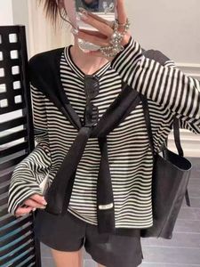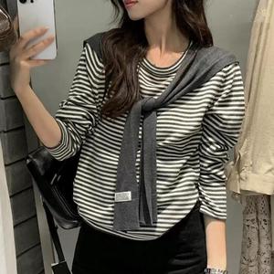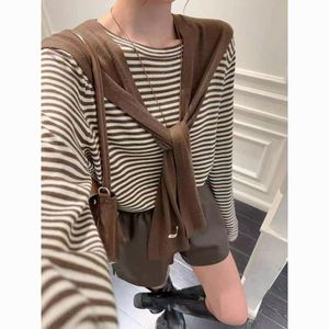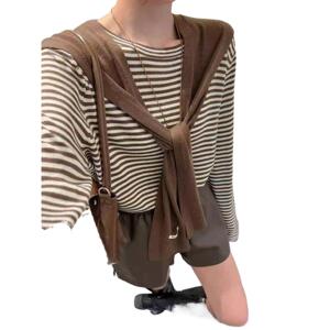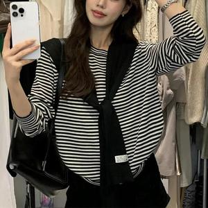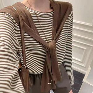 早秋2025套装ins针织衫新款长袖宽松披肩条纹T恤上衣针织两件套冰