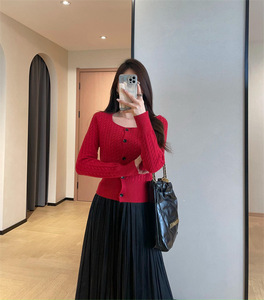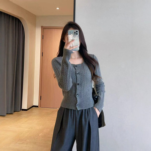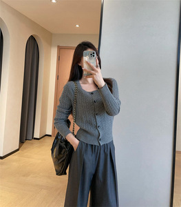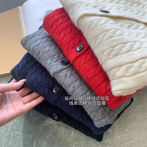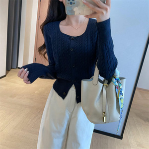 纸皮人显瘦链式绞花方领针织开衫短款小个子外套女2025秋
