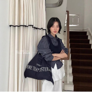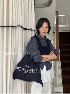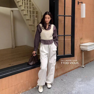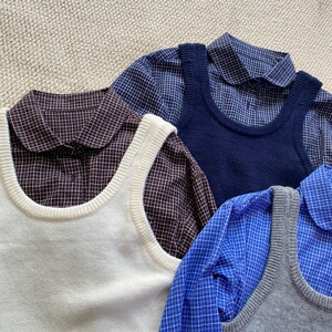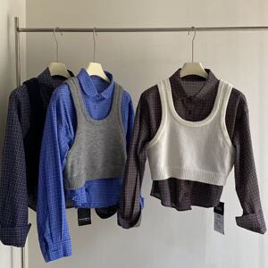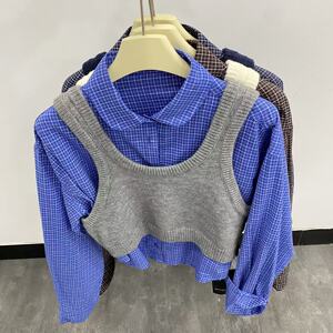 秋上新 复古翻领格子长袖衬衫叠穿针织马甲两件套上衣99608