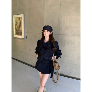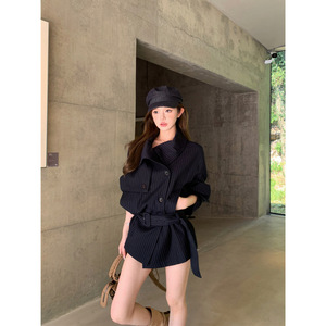 韩系气质辣妹设计感大翻领风衣收腰短款外套配腰带女