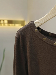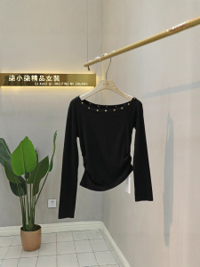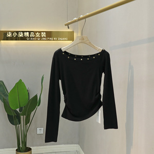 辣妹斜肩铆钉长袖t恤女2025秋季新款露肩修身短款打底衫上衣