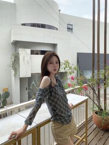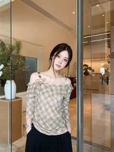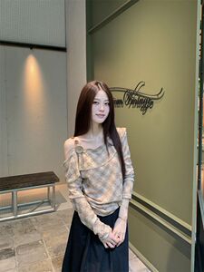 早秋季新款一字肩小衫设计感小心机斜肩修身格子长袖t恤女装上衣