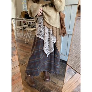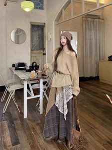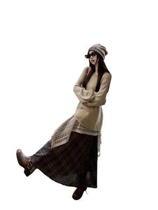 25新款时尚套装慵懒风宽松针织衫毛衣不规则格子拼接半身裙女