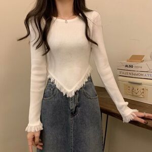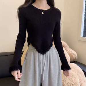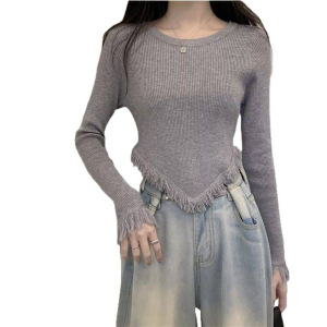 秋冬季设计圆领流苏不规则长袖T恤女修身百搭洋气外穿秋秋内搭女