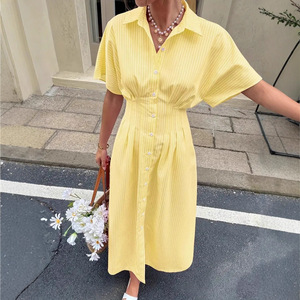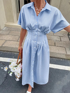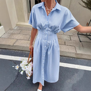 欧美跨境独立站时尚条纹短袖中长款压褶收腰下摆开衩连衣裙衬衫裙