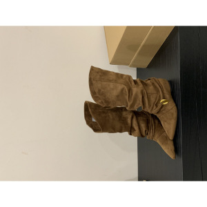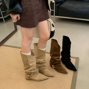 elingstudio 一眼爱上!枫叶棕尖头金属短靴女两穿复古绒面时装靴