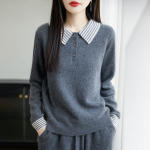 100%纯羊毛2025秋冬新款女士宽松拼色Polo翻领短款打底针织衫毛衣
