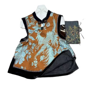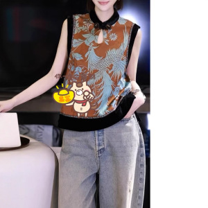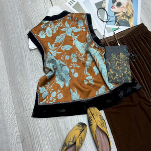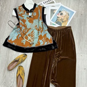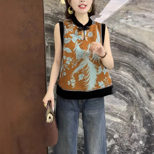 老钱风老缎真丝印花背心上衣下摆真丝丝绒拼接韵味古典宽松版马夹