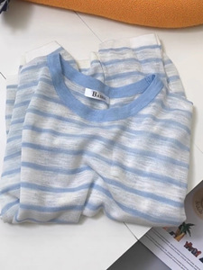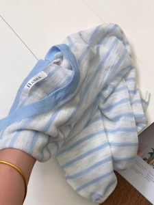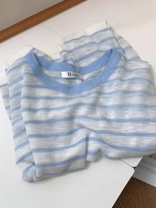 韩系ins风蓝色条纹冰丝针织罩衫女夏季新款独特超好看上衣潮