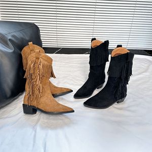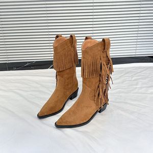 增高8CM流苏短筒美拉德骑士靴女2025新款法式尖头粗跟西部牛仔靴