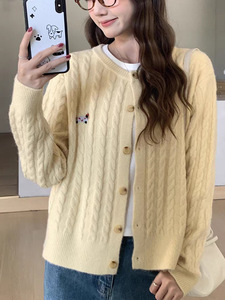 腊肠狗刺绣麻花毛衣开衫女2025早秋新款复古宽松慵懒针织上衣