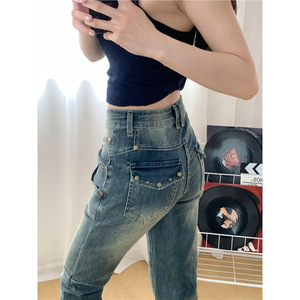 百搭新款美式复古高腰微喇牛仔裤女春秋季修身拖地显瘦马蹄喇叭裤
