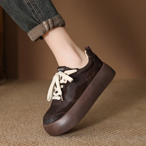 真皮女鞋2025秋冬新款韩版潮流休闲百搭拼色高帮鞋系带厚底单鞋