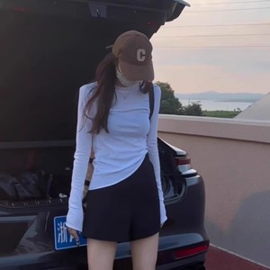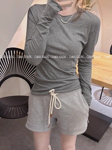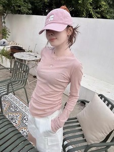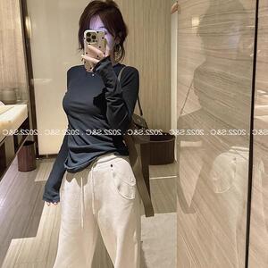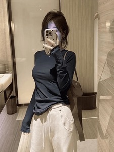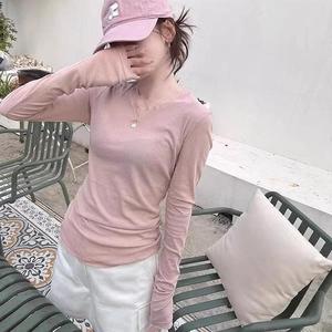 蓝色面膜长袖T恤内搭打底衫女秋季薄款圆领正肩修身纸片人上衣