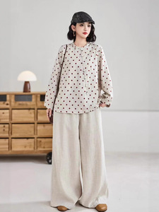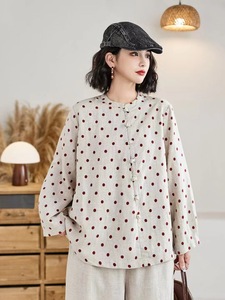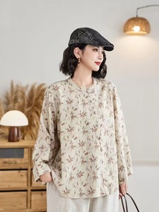 2025秋季新款复古亚麻盘扣上衣女立领印花长袖宽松新中式衬衣上衣