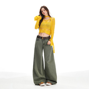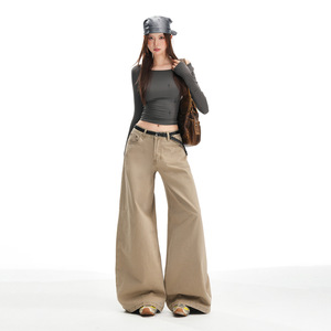 卡其色阔腿宽松牛仔裤女美式高街复古高腰显瘦高个子拖地直筒长裤