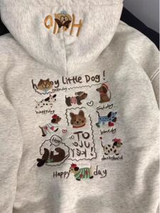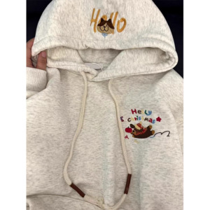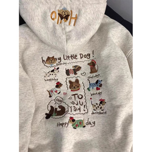灰色小狗刺绣套头连帽卫衣女秋冬加绒加厚休闲宽松设计感长袖上衣
