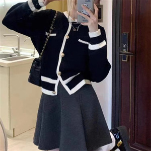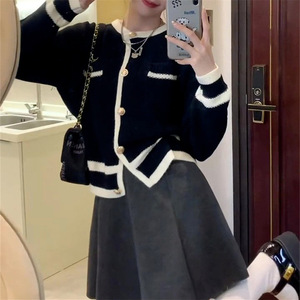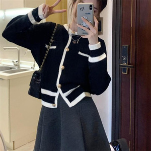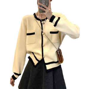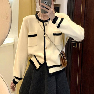 小香风拼色毛衣女外套2025年春秋韩系慵懒风宽松外搭针织开衫上衣