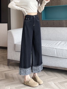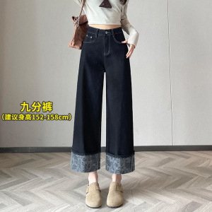 小个子高腰直筒牛仔裤女2025年秋季印花翻脚边八九分设计宽松裤子