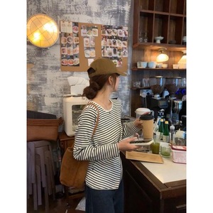 韩版交叉纽扣收腰显瘦长袖上衣早秋百搭洋气条纹针织衫上衣