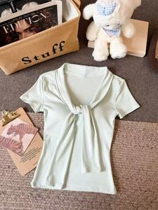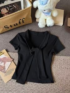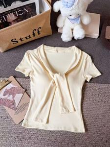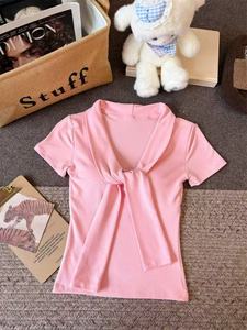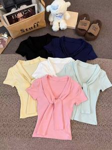 5150#韩系飘带V领短袖正肩T恤女带胸垫修身显瘦短款气质百搭上衣