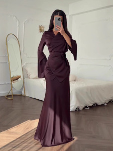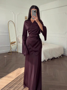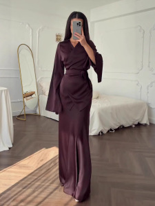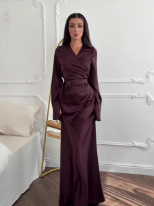 欧美亚马逊外贸跨境女装交叉领长袖收腰长裙两件套气质纯色套装女