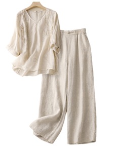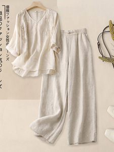 2025新款夏季亚麻套装女高端五分袖V领刺绣衬衫棉麻阔腿裤两件套