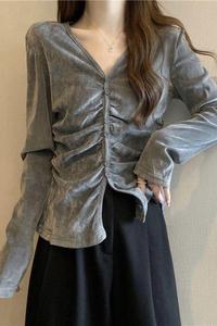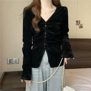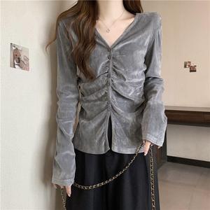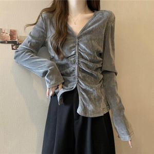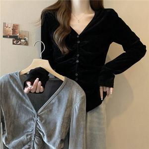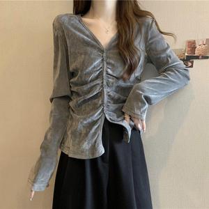 丝绒v领打底衫女秋秋大码胖mm显瘦洋气内搭设计感开叉不规则上衣