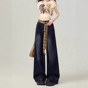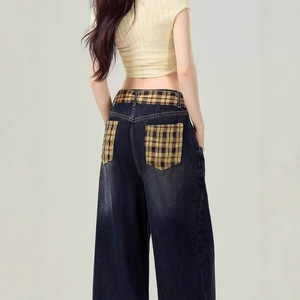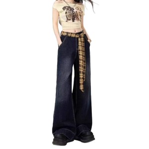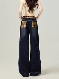蓝灰色格纹拼接阔腿牛仔裤女春秋新款宽松显瘦高腰直筒拖地长裤潮