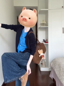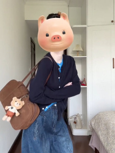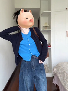 欧货独特别致蓝色假两件针织开衫女春秋撞色拼接毛衣外套洋气上衣