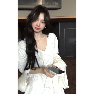 早秋法式温柔风甜美v领镂空衬衫减龄洋气时尚蓬蓬短裙子