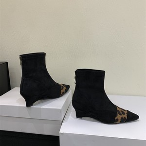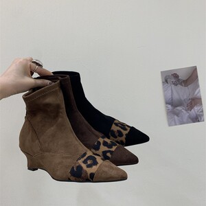 小香风拼接绒面马丁靴2025秋冬新款坡跟豹纹小众复古时装靴欧美女