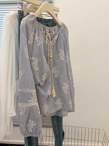 蓝色刺绣系带长袖防晒衬衫女宽松气质衬衣雪纺衫气质小衫新中式秋